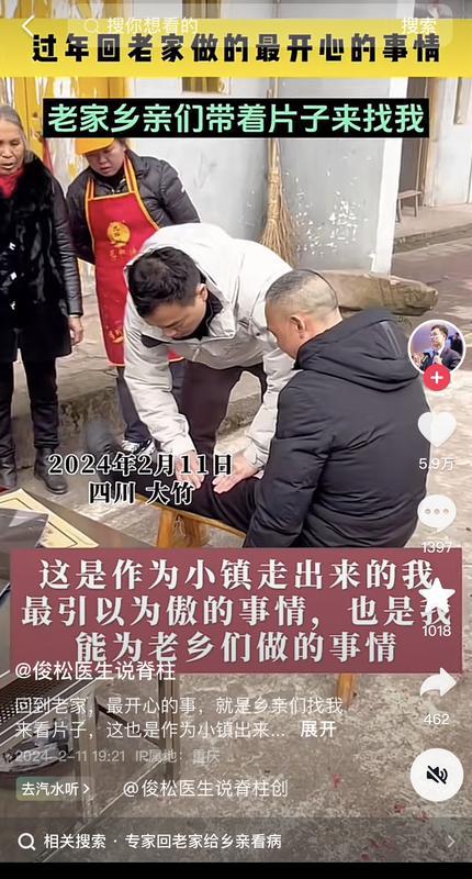 今年春节,西安市红会医院脊柱病医院腰椎病区骨科医生杨俊松,决定回老家四川省达州市大竹县与家人团聚。回到家乡的杨俊松发现,不少留守老人年龄大了身体不好,还不会用智能手机,导致获取健康知识的渠道有限。杨俊松到家后不久,亲戚、街坊甚至邻村的病人都来到他家门前。有人带着检查报告和医学影像希望杨俊松给点儿治疗建议,有人描述着自己的症状想问清到底是咋回事……面对大家的问诊诉求,杨俊松耐心、细致地进行解答。