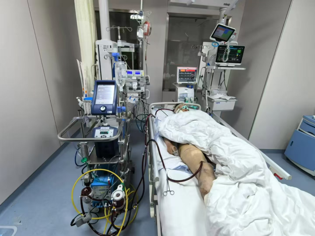 西安市红会医院EICU柳林主治医师介绍说,刚入住时,小王意识不清、呼吸微弱、生命体征极不稳定,血压低至警戒线,血氧饱和度如断崖般持续下跌,生命被紧紧束缚在生死边缘。更为棘手的是,肺部CT结果显示,小王整个肺部呈现白色,充满大量血性分泌物,肺功能已经衰竭,呼吸机高压力纯氧辅助治疗也已无法满足他对氧气的迫切需求。