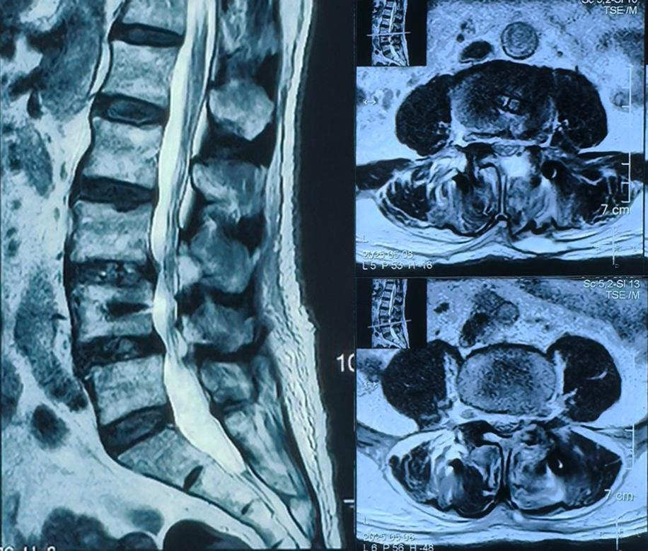 术前核磁:腰3-4、腰4-5椎体滑脱伴腰椎管狭窄