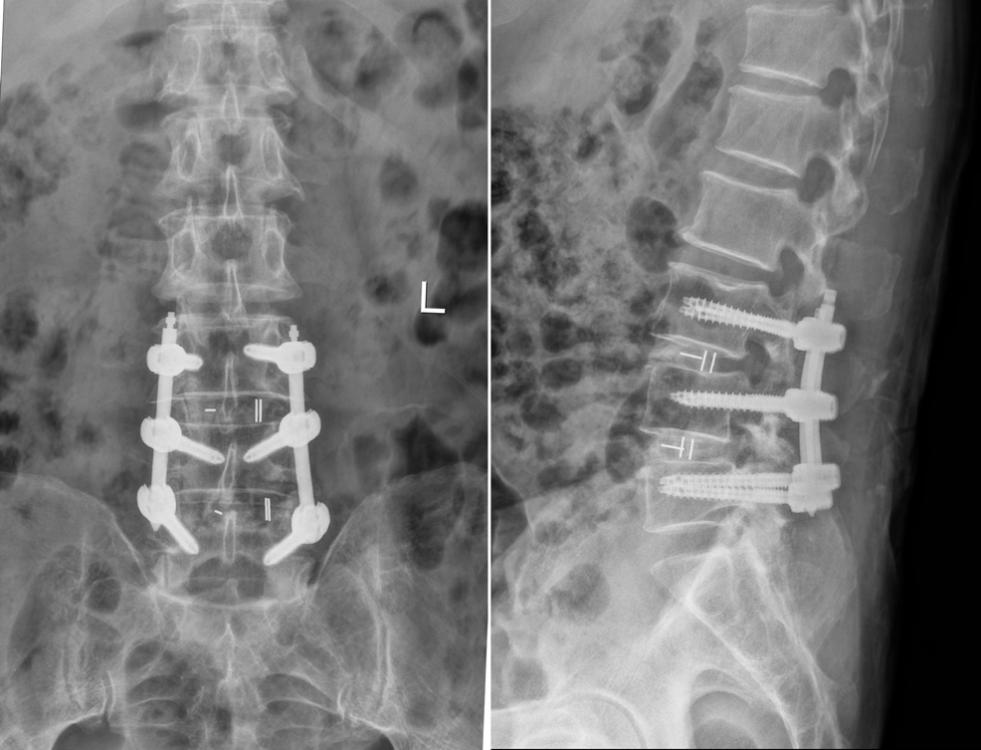 术后X线:腰椎滑脱复位,融合器横置恢复腰椎曲度