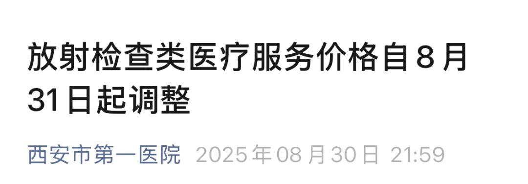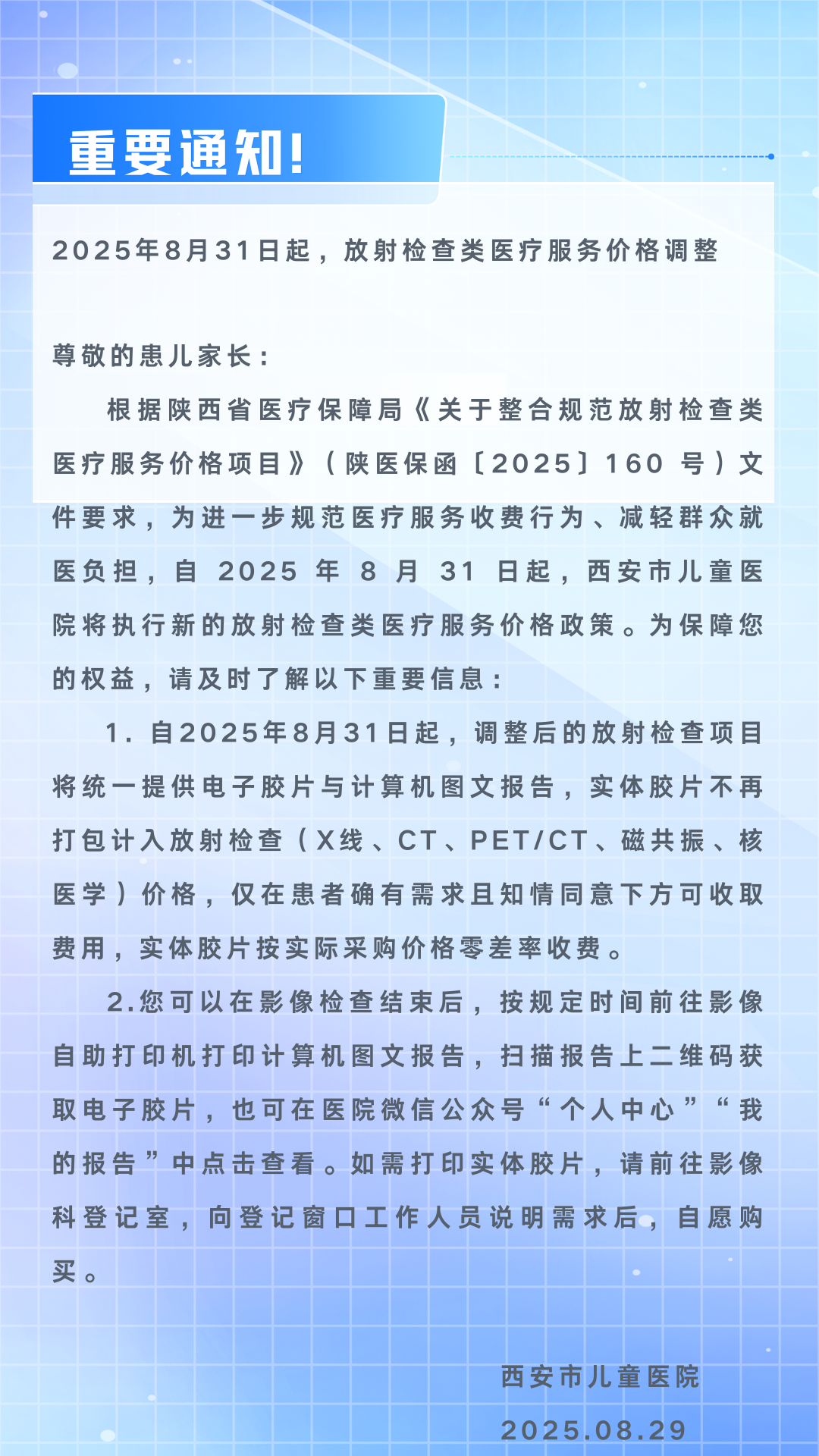根据陕西省医疗保障局《关于整合规范放射检查类医疗服务价格项目》(陕医保函〔2025〕160号)文件要求,为进一步规范医疗服务收费行为、减轻群众就医负担,自2025年8月31日起,西安市儿童医院将执行新的放射检查类医疗服务价格政策。为保障您的权益,请及时了解以下重要信息: