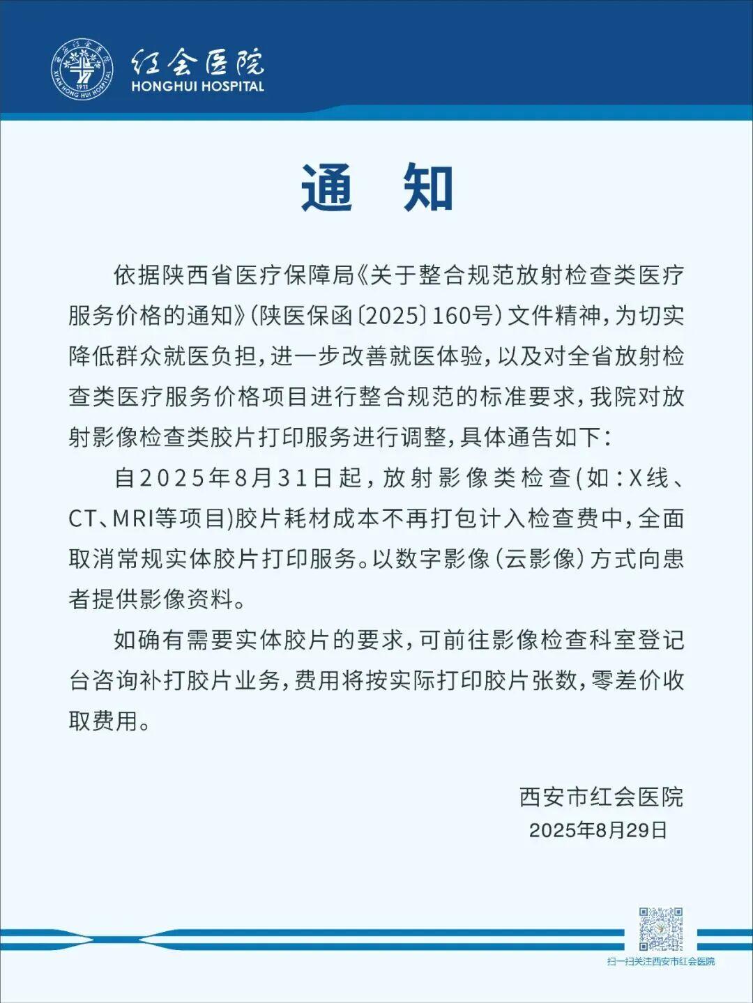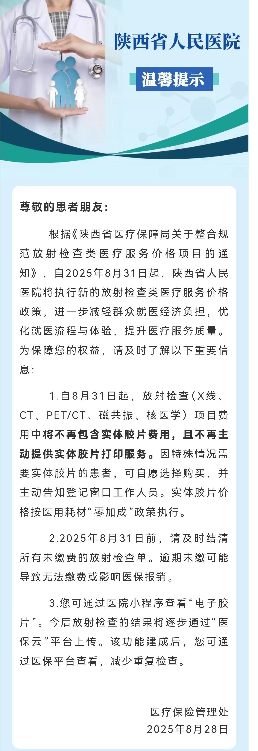 依据陕西省医疗保障局《关于整合规范放射检查类医疗服务价格的通知》(陕医保函〔2025〕160号)文件精神,为切实降低群众就医负担,进一步改善就医体验,以及对全省放射检查类医疗服务价格项目进行整合规范的标准要求,我院对放射影像检查类胶片打印服务进行调整,具体通告如下: