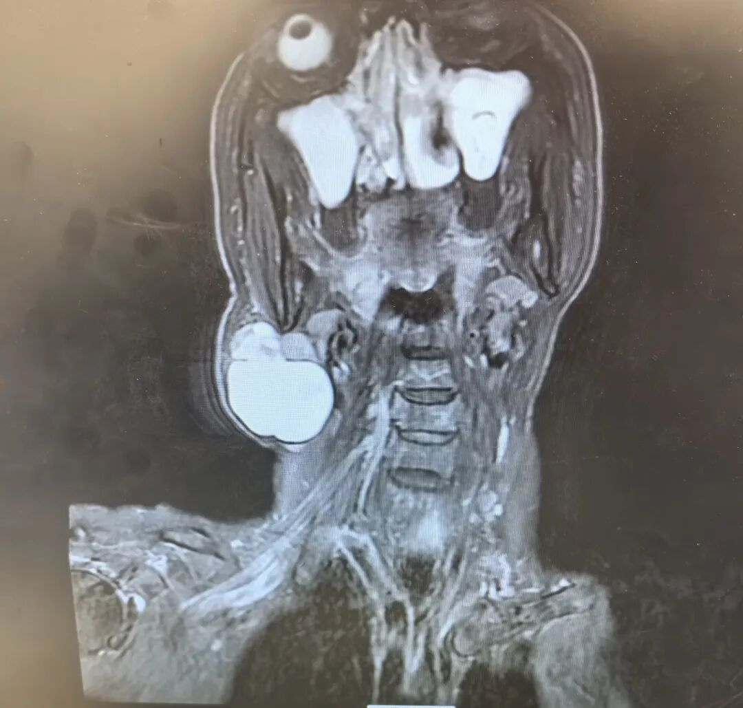 71 岁的韩女士右侧颈部曾有一处 0.5cm×0.5cm 的包块,在长达十年的时间里,这颗包块无明显变化,并未引起韩女士过多的关注。然而,1 年前,这颗原本“安静”的肿物毫无征兆地开始快速生长,最终增大至 8.0cm×8.0cm。肿物的急剧增大给韩女士的生活带来了严重困扰,她随即前往西安市红会医院耳鼻咽喉头颈整形修复科就诊。