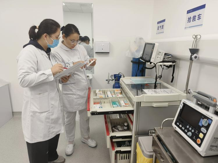 护士长王菁介绍到血液净化中心已经备足了超过日常用量30%的透析耗材和药品,小到一根穿刺针,大到一台备用透析机,护理团队都做了双重检查,确保节日期间物资供应万无一失。抢救室急救车内,除颤仪、吸引器、心电监护仪、各类急救药品等也已完成清点与测试,处于随时可用的应急状态。