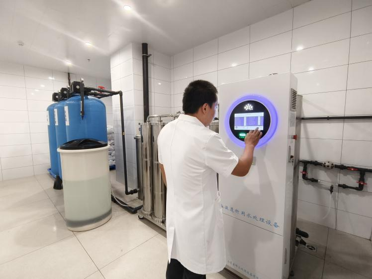 在透析治疗区,何工程师正对每一台透析机、水处理系统进行着最后的“体检”。从电导度到超滤精度,每一个参数都被反复校准,确保机器“零故障”运行。