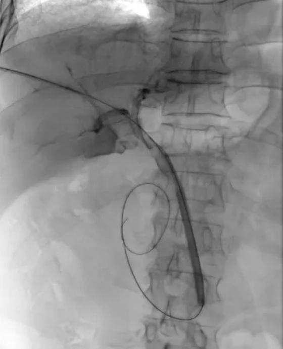 核心步骤随之展开:一根在介入手术中极为常见的6F普通血管成形球囊,沿着通道被送至结石下方。连接压力泵,球囊缓缓张开,形成一个柔和的“推力面”。在透视屏幕的监视下,医生如同一位沉稳的“推手”,运用巧劲,稳健地将这颗困扰多日的结石,轻轻地“推”过了Oddi括约肌,进入了宽阔的十二指肠。