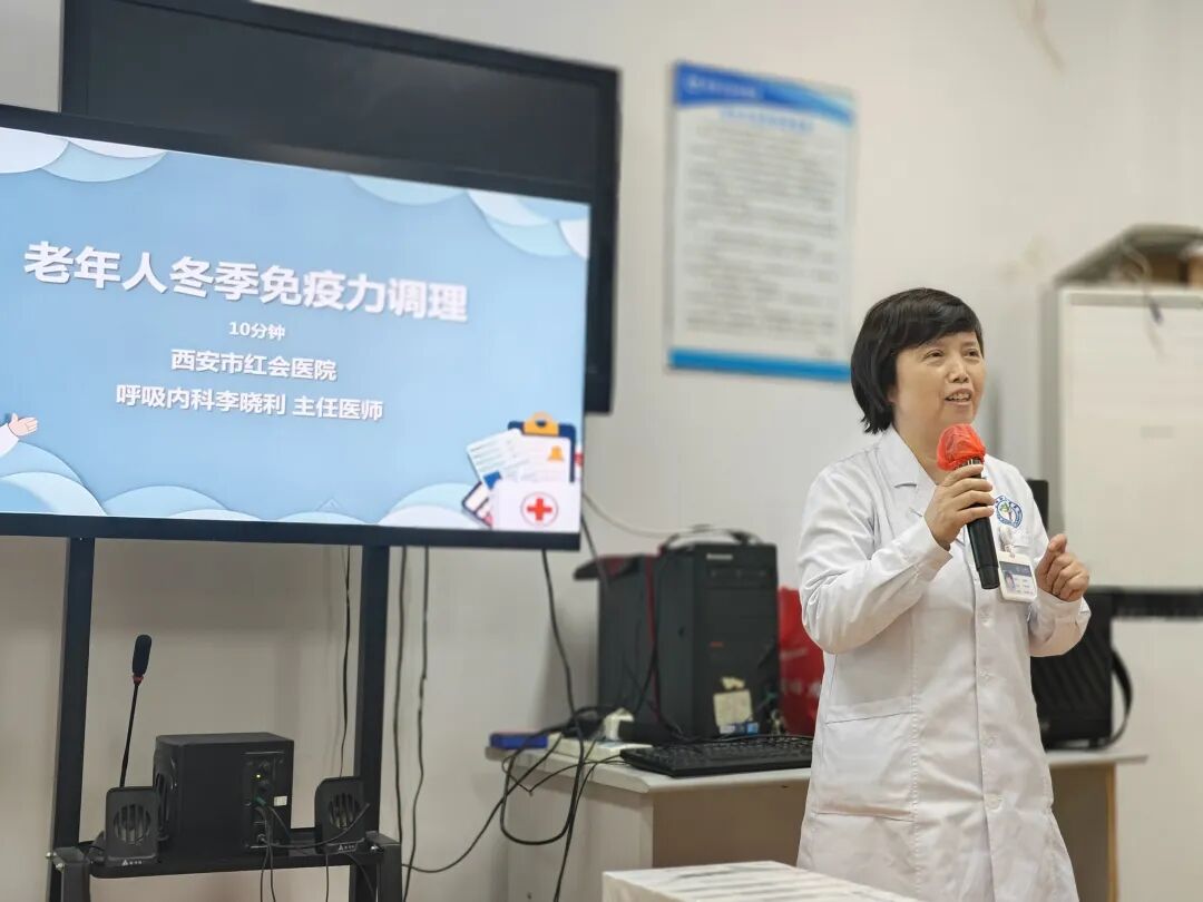 健康知识讲座环节。西安市红会医院呼吸内科主任李晓利以“老年人冬季免疫力调理”为主题,进行了一场深入浅出的科普讲座。李主任结合秋冬季气候特点,用通俗易懂的语言,详细讲解了流感、普通感冒、慢性阻塞性肺疾病(COPD)急性加重、肺炎等常见呼吸道疾病的发病原因、典型症状、传播途径以及科学的预防措施。她特别强调了疫苗接种、规范佩戴口罩、勤通风、勤洗手、合理膳食及适度锻炼在预防呼吸道传染病中的关键作用,讲座内容贴近实际,实用性强,受到了在场听众的热烈欢迎。