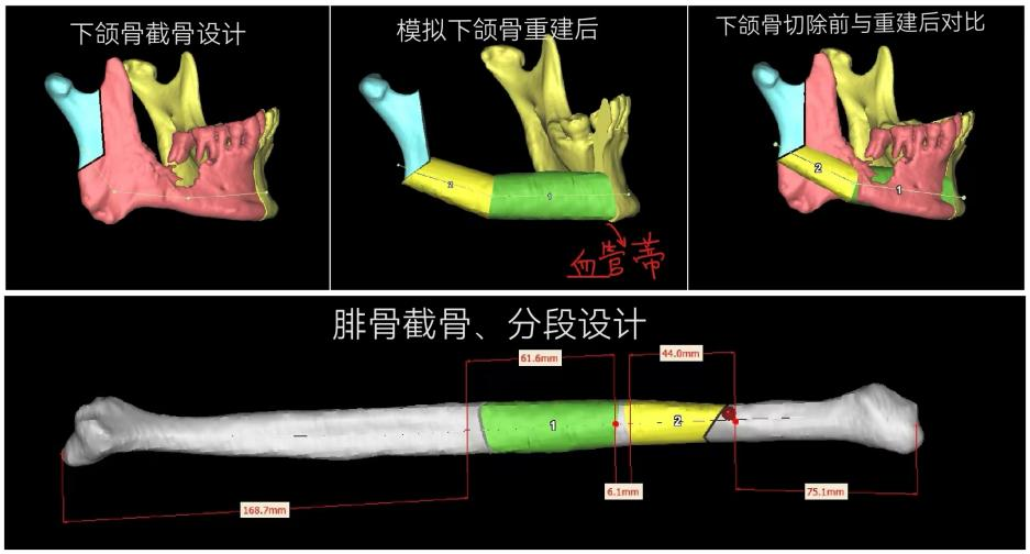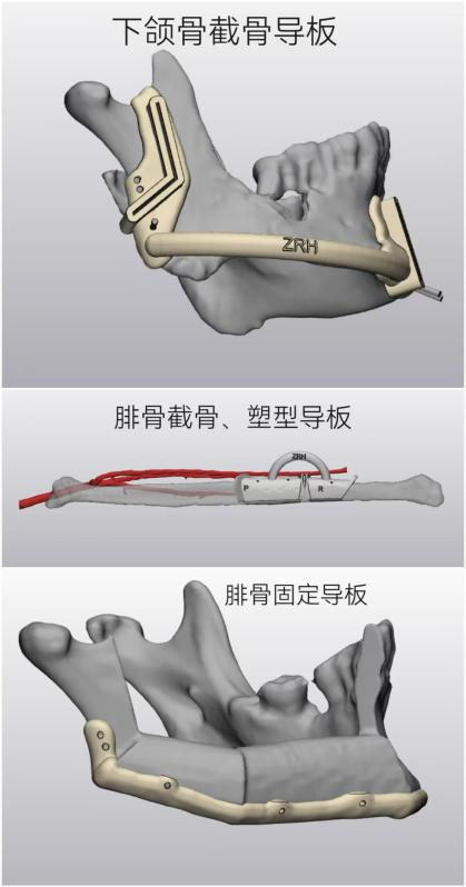 整块切除后,患者颌面部形成复杂缺损:既有上颌骨、下颌骨的骨组织缺损(影响面部轮廓和咀嚼功能),又有半舌、口底、软腭的软组织缺损(影响吞咽、发音),还有口腔黏膜缺损和口鼻贯通(影响口腔闭合和黏膜保护)。需同时重建骨性结构、修复软组织缺损并且覆盖口内大面积创面,单一修复方式无法满足需求,手术团队最终确定采用右侧腓骨 - 肌 - 皮瓣这一复合组织瓣进行一站式修复,同时解决骨、软组织、创面三大缺损问题。术前进行了下颌骨切除、腓骨瓣切取及塑形的数字化设计,同时3D打印下颌骨及腓骨截骨导板、腓骨塑形及复位导板,确保手术精准、快速实施。