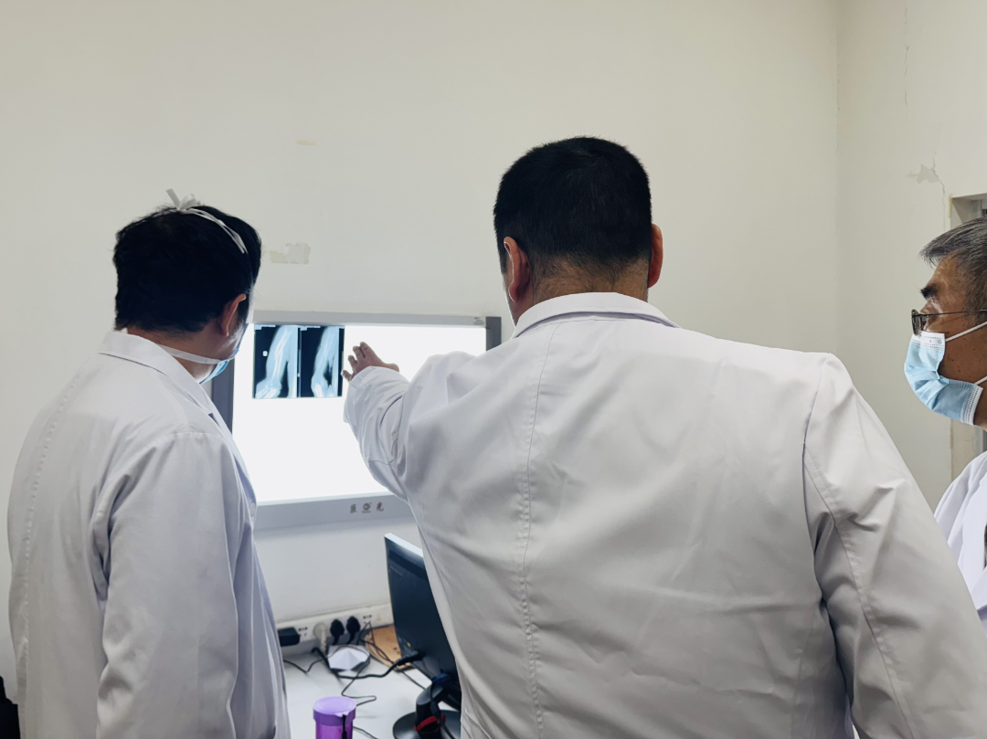手法复位室周健副主任医师接诊后,迅速对患者进行了细致的体格检查与影像学评估。为最大程度减轻患者创伤、缩短康复周期,他第一时间邀请科主任董博主任医师共同会诊,开展病例讨论。两位专家结合患者年龄、骨折类型及全身状况,经过严谨研判与充分的医患沟通,最终决定为其实施手法复位+患肢外固定的治疗方案。