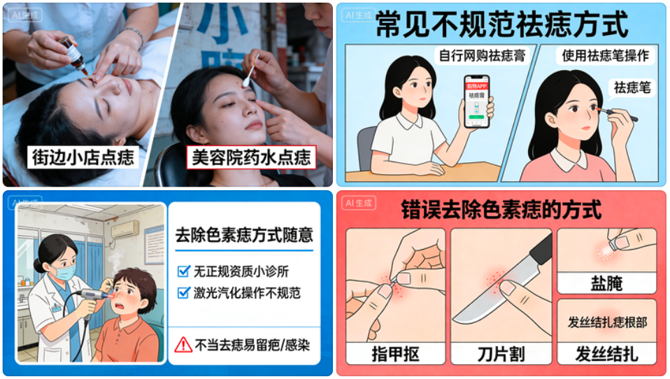 生活中,很多人去除色素痣的方式都非常随意:在街边小店、美容院用药水点痣,自行网购祛痣膏、祛痣笔,在不具备正规资质的小诊所随意用激光汽化,还有人自己用指甲抠、刀片割,甚至用盐腌、发丝结扎的方式试图「根除」。这些做法看似简单、省钱,却隐藏着巨大风险。一方面,对于直径超过 2 毫米的色素痣,往往累及到真皮层,药水、激光等方式很难将其彻底清除,残留的痣细胞受到反复刺激后,就可能发生恶变;另一方面,有些看似普通的色素痣,本身就是早期黑色素瘤的雏形,非专业人士无法鉴别其良恶性,盲目去除后,不仅会导致病情延误,还可能加速癌细胞转移。