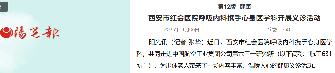 阳光讯(记者 张华)近日,西安市红会医院呼吸内科携手心身医学科,共同走进中国航空工业集团公司第六三一研究所(以下简称“航工631所”),为退休老人带来了一场内容丰富、温暖人心的健康义诊活动。 在健康知识讲座环节。西安市红会医院呼吸内科主任李晓利以“老年人冬季…