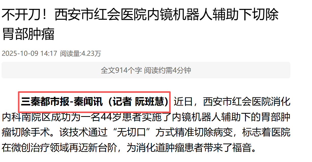 三秦都市报-秦闻讯(记者 阮班慧)近日,西安市红会医院消化内科南院区成功为一名44岁患者实施了内镜机器人辅助下的胃部肿瘤切除手术。该技术通过“无切口”方式精准切除病变,标志着医院在微创治疗领域再迈新台阶,为消化道肿瘤患者带来了福音。病情发现:肿瘤增大,微创方案…