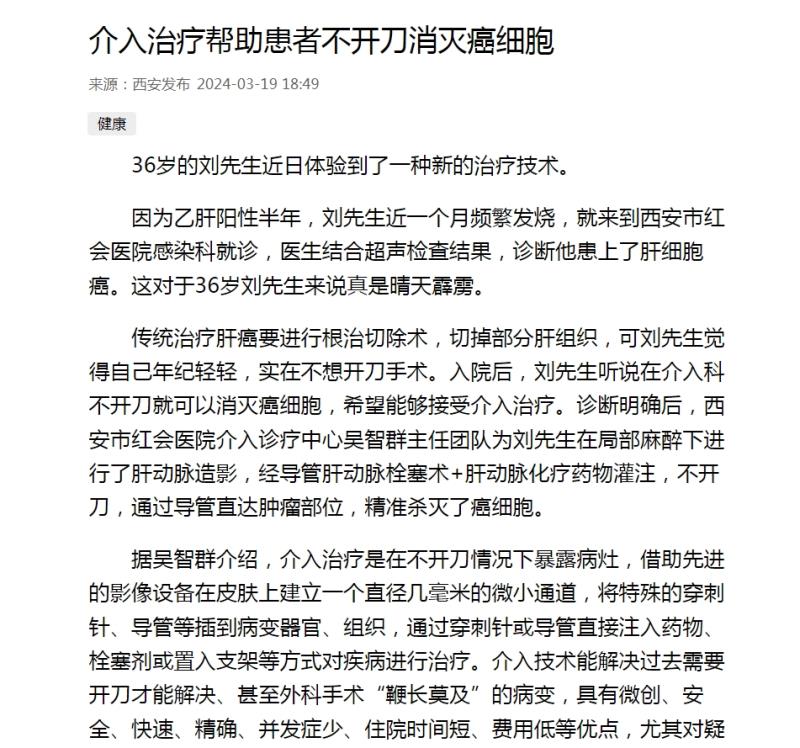 三秦都市报-三秦网讯(记者 阮班慧)36岁的刘先生近日体验到了一种新的治疗技术。因为乙肝阳性半年,刘先生近一个月频繁发烧,就来到西安市红会医院感染科就诊,医生结合超声检查结果,诊断他患上了肝细胞癌。这对于36岁刘先生来说真是晴天霹雳。传统治疗肝癌要进行根治切除术…