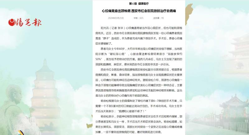 阳光讯(记者 张华)心绞痛通常被当作冠心病症状,但也可能和颈椎病有关。近日,西安市红会医院脊柱病院腰椎病区发现一位心绞痛患者病因竟是“脖子”造成的,并为患者完成内镜下微创手术。手术后,患者心绞痛症状便缓解了。 患者冯女士今年60岁,大约半年前出现心绞痛症状持…