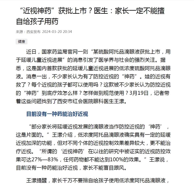 近日,国家药监局官网一则“某硫酸阿托品滴眼液获批上市,用于延缓儿童近视进展”的消息引发了医学界与社会的强烈关注。据悉,这是国内首款获批的延缓儿童近视进展的低浓度硫酸阿托品滴眼液。消息一出,不少家长认为有了防控近视的“神药”。娃的近视有救了?每个近视的孩子都…
