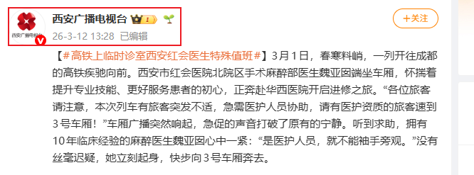 【#高铁上临时诊室西安红会医生特殊值班#】3月1日,春寒料峭,一列开往成都的高铁疾驰向前。西安市红会医院北院区手术麻醉部医生魏亚囡端坐车厢,怀揣着提升专业技能、更好服务患者的初心,正奔赴华西医院开启进修之旅。“各位旅客请注意,本次列车有旅客突发不适,急需医护人…