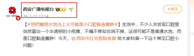【#别把嘴里水泡当上火可能是小口腔黏液囊肿#】生活中,不少人会发现口腔里突然冒出一个半透明的小疙瘩,不痛不痒却总消不掉,这很可能不是普通水泡,而是口腔黏液囊肿!今天,@西安市红会医院官微 给大家科普一下这个常见口腔小问题!为啥会得黏液囊肿? 口腔黏液囊肿的核心成…