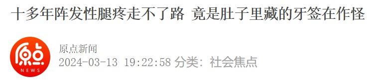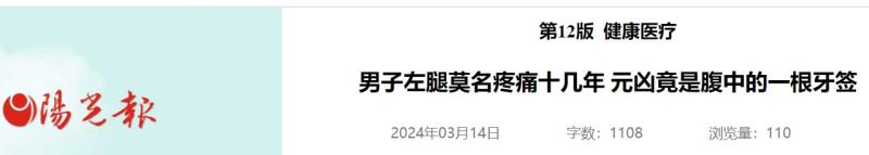 十多年里,王先生的左腿总出现间歇性疼痛,却一直没有找到病因,三个月前他疼得实在无法走路便来到西安市红会医院求医,没想到“罪魁祸首”竟是一根牙签。 影像检查腹腔内有异物 手术成了“拆盲盒” 王先生是咸阳人,今年46岁。十多年前他就常莫名感到左腿疼痛,但一会儿…