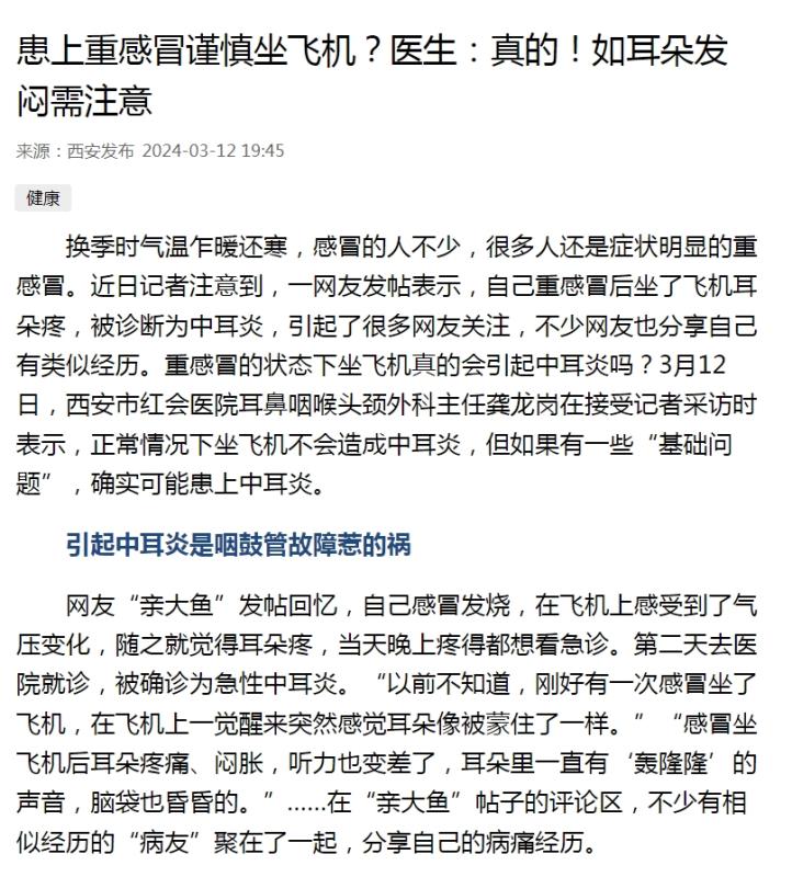 换季时气温乍暖还寒,感冒的人不少,很多人还是症状明显的重感冒。近日记者注意到,一网友发帖表示,自己重感冒后坐了飞机耳朵疼,被诊断为中耳炎,引起了很多网友关注,不少网友也分享自己有类似经历。重感冒的状态下坐飞机真的会引起中耳炎吗?3月12日,西安市红会医院耳鼻咽…