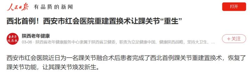 西安市红会医院近日为一名踝关节融合术后患者完成了西北首例踝关节重建置换术,恢复了踝关节功能,让其踝关节焕发新生。3月5日,记者在西安市红会医院(北院区)见到52岁的患者肖某玲,据其介绍,两年前她因为脊髓灰质炎出现足畸形,疼痛难忍,走不了路,就诊于西安市红会医院…