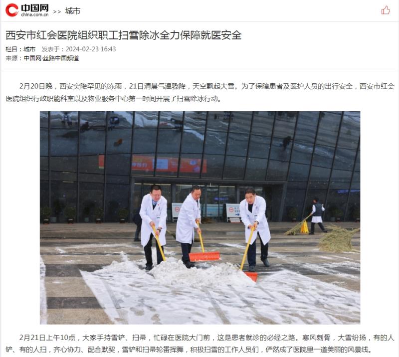 2月20日晚,西安突降罕见的冻雨,21日清晨气温骤降,天空飘起大雪。为了保障患者及医护人员的出行安全,西安市红会医院组织行政职能科室以及物业服务中心第一时间开展了扫雪除冰行动。2月21日上午10点,大家手持雪铲、扫帚,忙碌在医院大门前,这是患者就诊的必经之路。寒风刺…