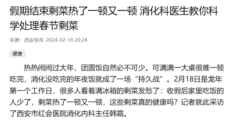 假期结束剩菜热了一顿又一顿 消化科医生教你科学处理春节剩菜热热闹闹过大年,团圆饭自然必不可少。可满满一大桌很难一顿吃完,消化没吃完的年夜饭就成了一场“持久战”。2月18日是龙年第一个工作日,很多人看着满冰箱的剩菜发愁了:收假后家里吃饭的人少了,剩菜热了一顿又一…