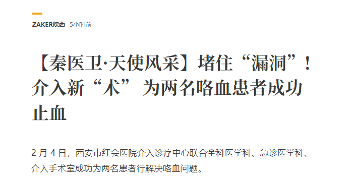 堵住“漏洞”! 介入新“术” 为两名咯血患者成功止血2 月 4 日,西安市红会医院介入诊疗中心联合全科医学科、急诊医学科、介入手术室成功为两名患者行解决咯血问题。案例回顾01患者刘先生(化名),间断咯血 2 个多月,曾于多家医院就诊疗效不佳,咯血的情况越来越重。患者及家…