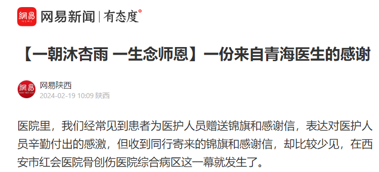 【一朝沐杏雨 一生念师恩】一份来自青海医生的感谢医院里,我们经常见到患者为医护人员赠送锦旗和感谢信,表达对医护人员辛勤付出的感激,但收到同行寄来的锦旗和感谢信,却比较少见,在西安市红会医院骨创伤医院综合病区这一幕就发生了。2023年11月6日至2024年2月6日,青海红…