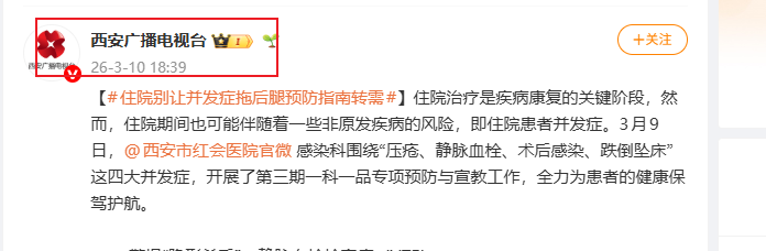 【#住院别让并发症拖后腿预防指南转需#】住院治疗是疾病康复的关键阶段,然而,住院期间也可能伴随着一些非原发疾病的风险,即住院患者并发症。3月9日,@西安市红会医院官微 感染科围绕“压疮、静脉血栓、术后感染、跌倒坠床”这四大并发症,开展了第三期一科一品专项预防与宣…
