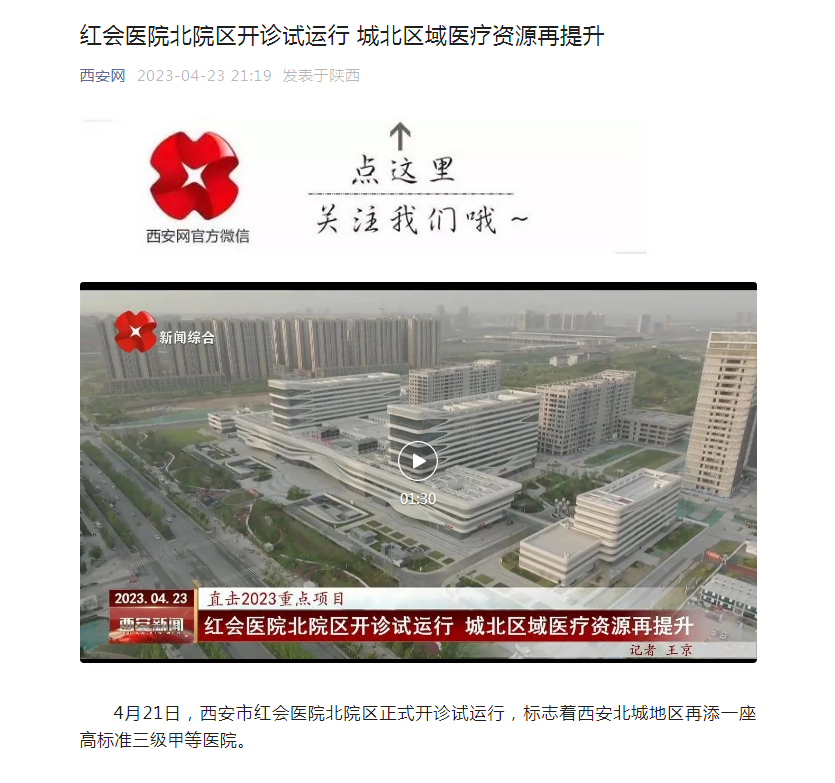4月21日,西安市红会医院北院区正式开诊试运行,标志着西安北城地区再添一座高标准三级甲等医院。