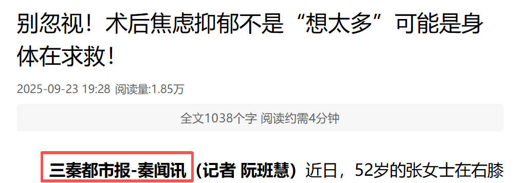 三秦都市报-秦闻讯(记者 阮班慧)近日,52岁的张女士在右膝关节置换术成功一个月后,却陷入了情绪困境——不仅持续情绪低落、焦虑不安,还伴有夜间失眠,面对康复训练更是满心恐惧。“手术很成功,但我就是高兴不起来,总担心会再次摔倒。腿稍微有点疼,就控制不住往坏处想,…