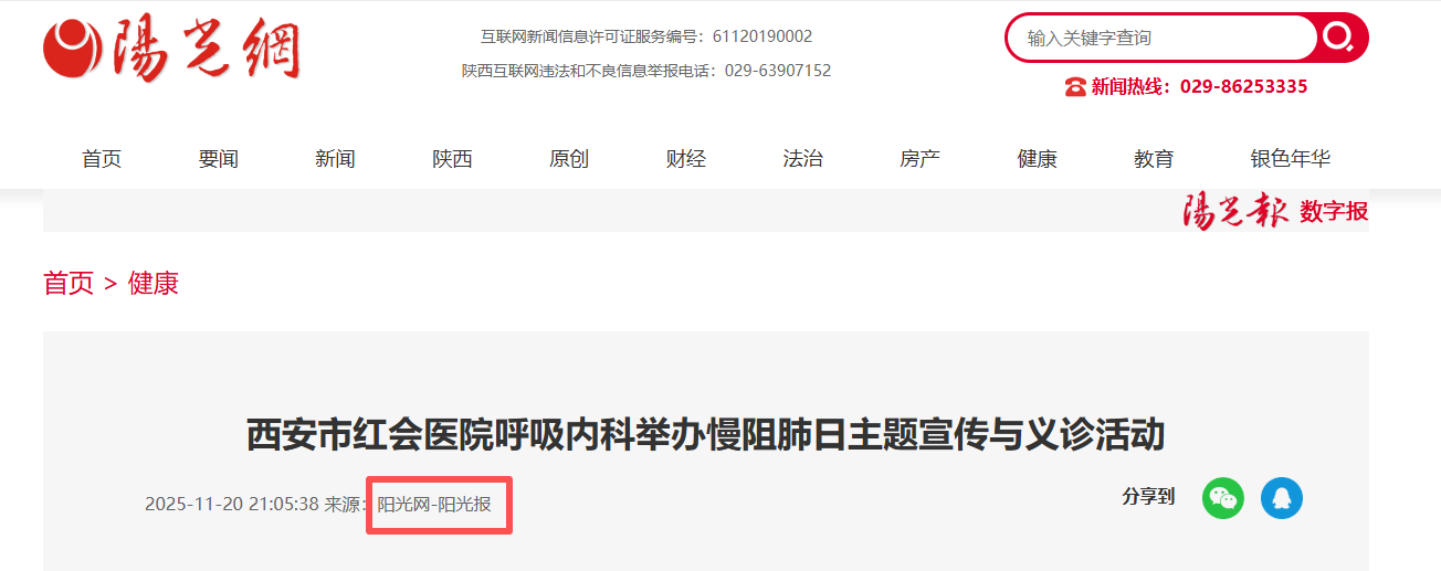 阳光讯(记者 郑亚雷 通讯员 蔡豪然)在第24个世界慢阻肺日来临之际,西安市红会医院呼吸内科在南院区门诊大厅举办了主题为“呼吸不畅,当心慢阻肺”的大型义诊活动。本次义诊专家团队由呼吸内科李晓利主任和科室的10余名医护人员组成,以普及慢性阻塞性肺疾病(简称“慢阻肺”…