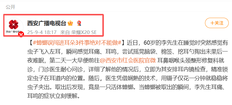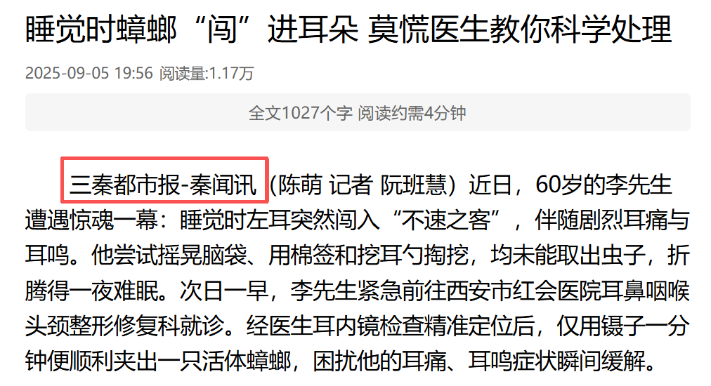 三秦都市报-秦闻讯(陈萌 记者 阮班慧)近日,60岁的李先生遭遇惊魂一幕:睡觉时左耳突然闯入“不速之客”,伴随剧烈耳痛与耳鸣。他尝试摇晃脑袋、用棉签和挖耳勺掏挖,均未能取出虫子,折腾得一夜难眠。次日一早,李先生紧急前往西安市红会医院耳鼻咽喉头颈整形修复科就诊。经…