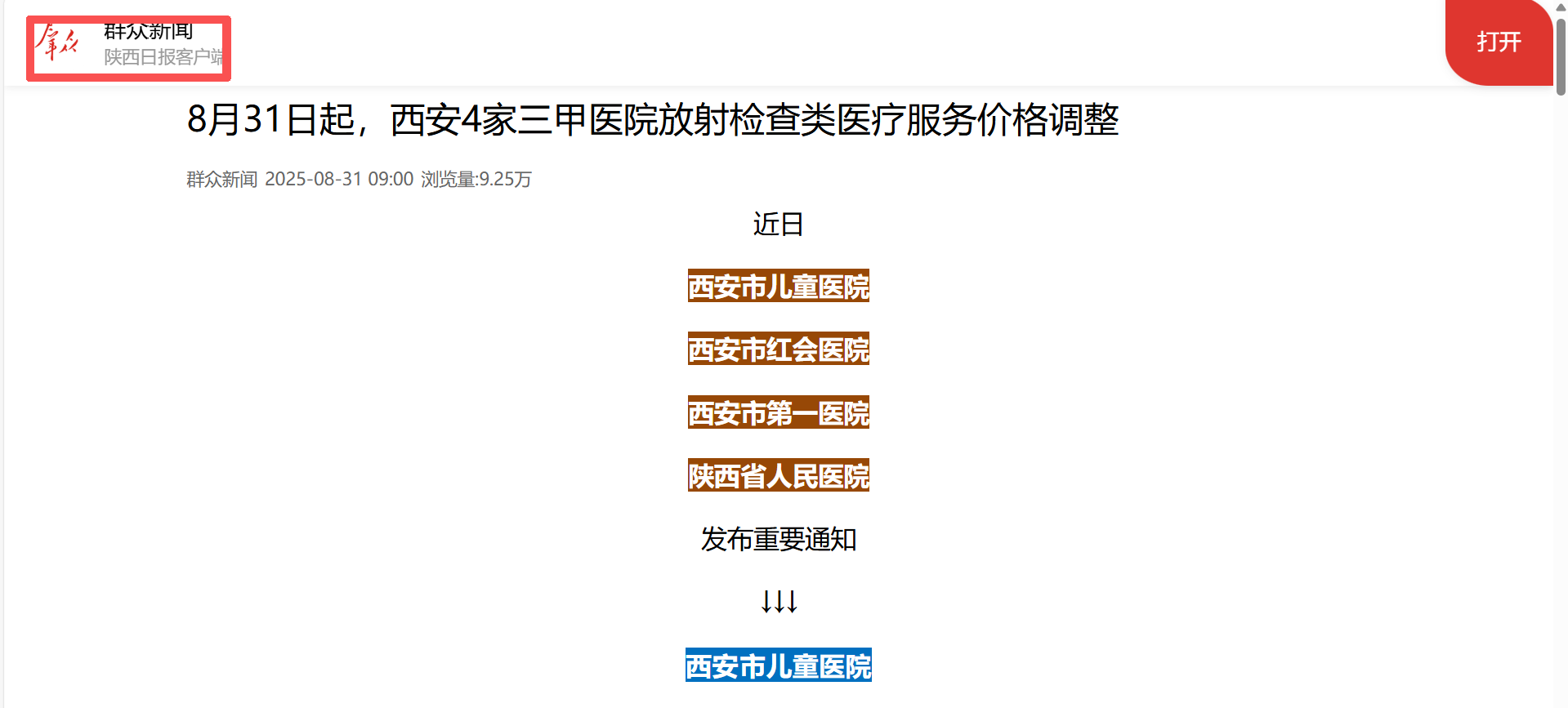 近日 西安市儿童医院 西安市红会医院 西安市第一医院 陕西省人民医院 发布重要通知 ↓↓↓ 西安市儿童医院尊敬的患儿家长:根据陕西省医疗保障局《关于整合规范放射检查类医疗服务价格项目》(陕医保函〔2025〕160号)文件要求,为进一步规范医疗服务收费…