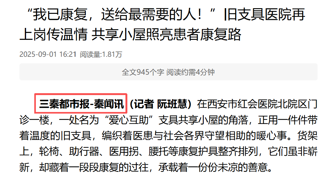 三秦都市报-秦闻讯(记者 阮班慧)在西安市红会医院北院区门诊一楼,一处名为“爱心互助”支具共享小屋的角落,正用一件件带着温度的旧支具,编织着医患与社会各界守望相助的暖心事。货架上,轮椅、助行器、医用拐、腰托等康复护具整齐排列,它们虽非崭新,却藏着一段段康复的…