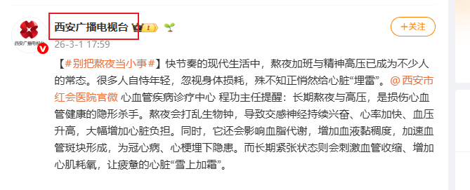 【#别把熬夜当小事#】快节奏的现代生活中,熬夜加班与精神高压已成为不少人的常态。很多人自恃年轻,忽视身体损耗,殊不知正悄然给心脏“埋雷”。@西安市红会医院官微 心血管疾病诊疗中心 程功主任提醒:长期熬夜与高压,是损伤心血管健康的隐形杀手。熬夜会打乱生物钟,导致交…