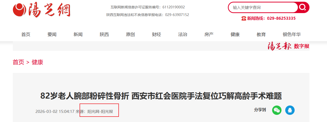 阳光讯(记者 郑亚雷)近日,西安市红会医院手法复位室接诊了一位82岁的高龄患者,该患者因意外摔倒,左腕突发剧烈肿胀、疼痛,肢体活动完全受限,其家属紧急将其送往西安市红会医院就诊。 接诊医师薛安邦经详细查体,结合X线影像学检查,明确诊断其为左尺骨远端合并桡骨远…