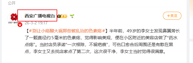 【#别让小痣酿大祸那些被乱治的色素痣#】半年前,49岁的李女士发现鼻翼旁长了一颗直径约5毫米的色素痣,觉得影响美观,便在小区附近的美容店做了“药水点痣”。当时店员承诺“一次根除,不留疤痕”,可伤口愈合后周围还是有散在黑点,李女士又去找店家点了第二次,这次很干净,…