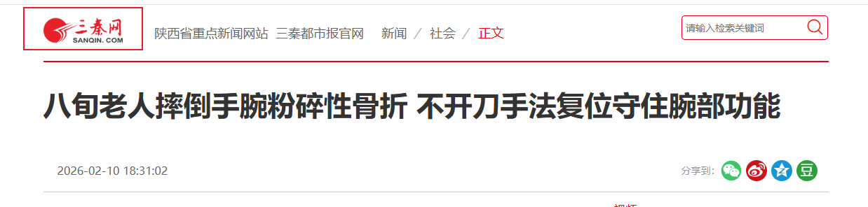 三秦都市报-三秦网讯(记者 阮班慧)近日,82岁的姚奶奶在家中行走时不慎跌倒,右手撑地后即感右腕部剧烈疼痛、明显肿胀伴畸形,活动完全受限。家属紧急将姚奶奶送至当地医院就诊,X线检查显示为右腕部粉碎性骨折并伴有移位。因病情复杂,当地医院建议转诊治疗。当晚,姚奶奶在…