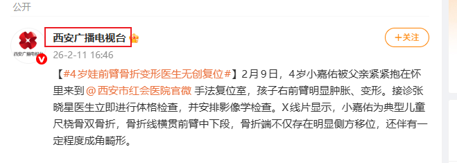【#4岁娃前臂骨折变形医生无创复位#】2月9日,4岁小嘉佑被父亲紧紧抱在怀里来到@西安市红会医院官微 手法复位室,孩子右前臂明显肿胀、变形。接诊张晓星医生立即进行体格检查,并安排影像学检查。X线片显示,小嘉佑为典型儿童尺桡骨双骨折,骨折线横贯前臂中下段,骨折端不仅存…