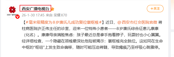 【#毫米级精度为8岁唐氏儿成功复位寰枢椎#】近日,@西安市红会医院官微 脊柱病医院许正伟主任的诊室,迎来一位特殊小患者——8岁唐氏综合征患儿康康(化名)。康康母亲满脸焦虑:孩子最近总是拿手抱着脖子,玩耍时也小心翼翼。经详细检查,一个隐藏在颈椎最深处危险被揭示:寰…