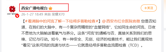 【#看清脑中的河流了解一下经颅多普勒检查#】@西安市红会医院官微 您是否知道,在我们的大脑中,有一个复杂而精密的“血管网络”,它如同生命的河流,日夜不息地为大脑输送着氧气与养分。这条“河流”的通畅与否,直接关系到我们的思维、记忆与行动。如今,有一种安全、无创、…