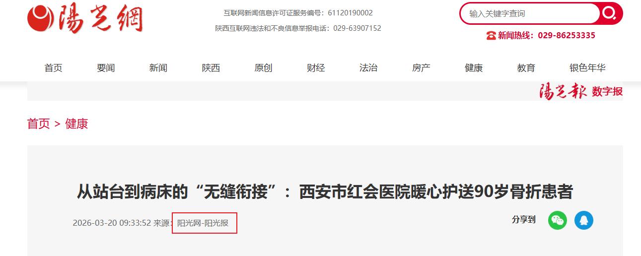 阳光讯(记者 郑亚雷)近日,西安市红会医院北客站接待中心接到一通紧急求助电话。电话那头,家属语气焦急:“我母亲今年90岁,不慎摔伤左腿,当地医院确诊为股骨颈骨折并建议转至贵院手术。我们将于下午4点55分抵达西安北站,听闻医院提供无偿转运服务,想请求帮忙接送老人!…