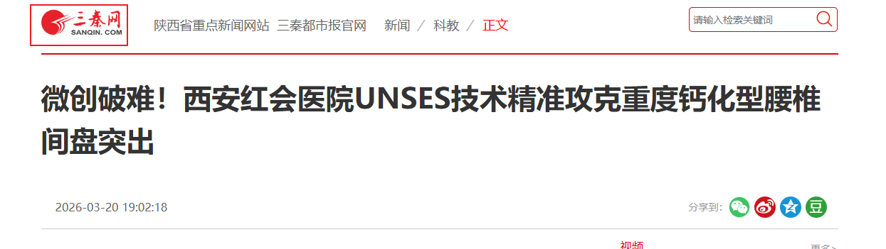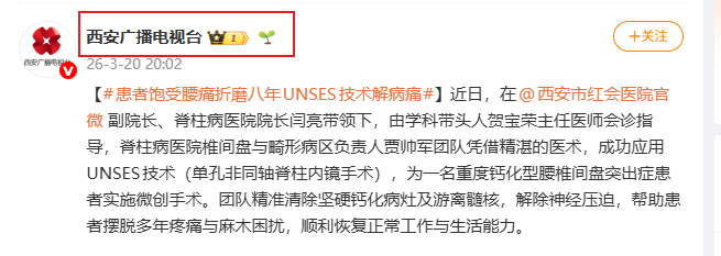 【#患者饱受腰痛折磨八年UNSES技术解病痛#】近日,在@西安市红会医院官微 副院长、脊柱病医院院长闫亮带领下,由学科带头人贺宝荣主任医师会诊指导,脊柱病医院椎间盘与畸形病区负责人贾帅军团队凭借精湛的医术,成功应用UNSES技术(单孔非同轴脊柱内镜手术),为一名重度钙化…
