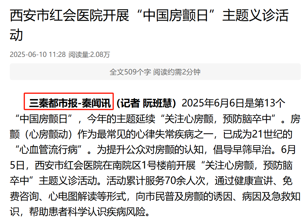 三秦都市报-秦闻讯(记者 阮班慧)2025年6月6日是第13个“中国房颤日”,今年的主题延续“关注心房颤,预防脑卒中”。房颤(心房颤动)作为最常见的心律失常疾病之一,已成为21世纪的“心血管流行病”。为提升公众对房颤的认知,倡导早筛早治。6月5日,西安市红会医院在南院区…