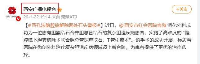 【#四孔法腹腔镜解除两处石头警报#】近日,@西安市红会医院官微 消化外科成功为一位患有胆囊结石合并胆总管结石的复杂胆道疾病患者,实施了高难度的 “腹腔镜下胆囊切除术联合胆总管探查取石、T管引流术”。该手术的成功开展,标志着医院在微创外科治疗复杂胆道疾病领域迈上新…