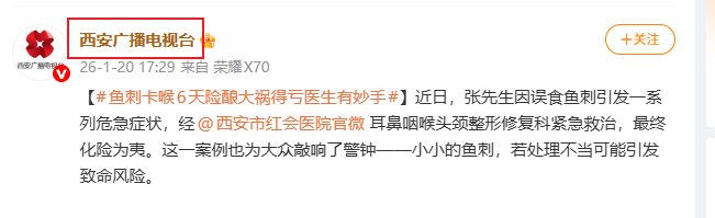【#鱼刺卡喉6天险酿大祸得亏医生有妙手#】近日,张先生因误食鱼刺引发一系列危急症状,经@西安市红会医院官微 耳鼻咽喉头颈整形修复科紧急救治,最终化险为夷。这一案例也为大众敲响了警钟——小小的鱼刺,若处理不当可能引发致命风险。张先生6天前不慎吞食鱼刺,随后出现吞咽…