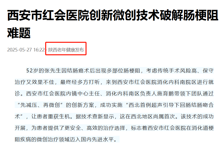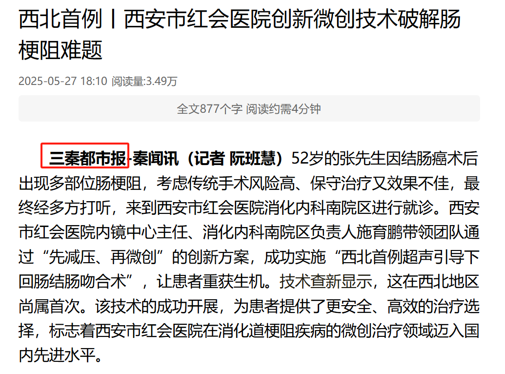52岁的张先生因结肠癌术后出现多部位肠梗阻,考虑传统手术风险高、保守治疗又效果不佳,最终经多方打听,来到西安市红会医院消化内科南院区进行就诊。西安市红会医院内镜中心主任、消化内科南区负责人施育鹏带领下团队通过“先减压、再微创”的创新方案,成功实施“西北首例超…
