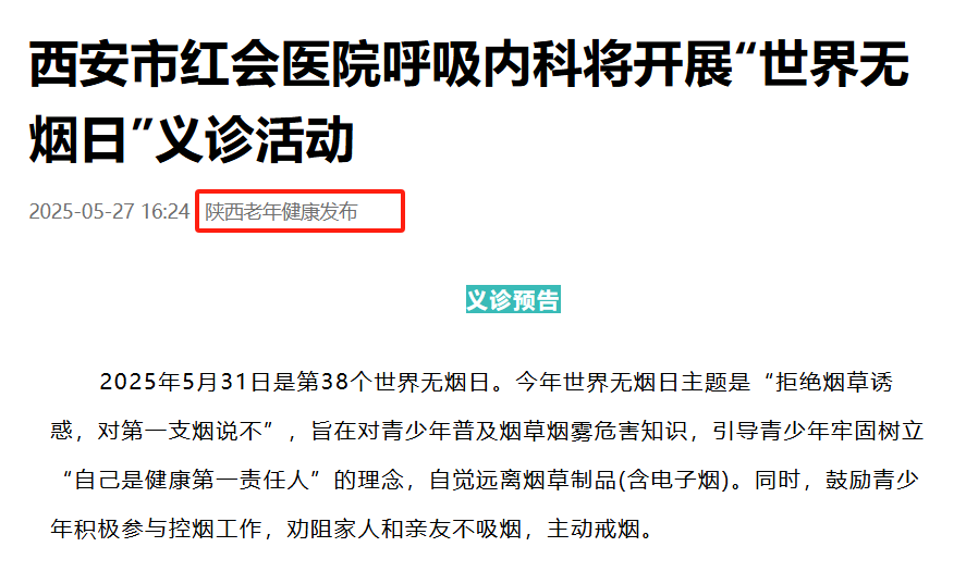 义诊预告 2025年5月31日是第38个世界无烟日。今年世界无烟日主题是“拒绝烟草诱惑,对第一支烟说不”,旨在对青少年普及烟草烟雾危害知识,引导青少年牢固树立“自己是健康第一责任人”的理念,自觉远离烟草制品(含电子烟)。同时,鼓励青少年积极参与控烟工作,劝阻家人和亲…