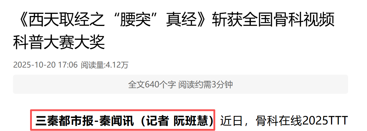 三秦都市报-秦闻讯(记者 阮班慧)近日,骨科在线2025TTT(Tip-Top-Talk)全国骨科科普大赛落下帷幕,西安市红会医院脊柱病院腰椎病区杨俊松副主任医师创作的视频科普作品《西天取经之“腰突”真经》,凭借专业内容与创新形式,历经初赛、复赛、半决赛层层选拔,从全国众多参赛…